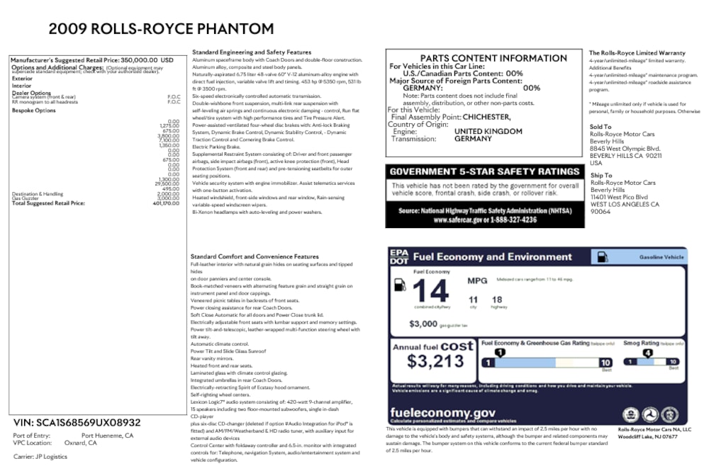 Only 2009 Rolls-Royce Phantom CPO in the Country! 6.75L V12 DI DOHC 48V RWD 6-Speed Automatic with Overdrive 11/18 City/Highway MPG Phantom Come See this Rolls-Royce and Many More at Rolls-Royce Motor Cars Raleigh!!, A Full List of Optional Equipment can be seen by Clicking the Window Sticker Button Above!!, Provenance Certified Pre-Owned Certified, Black Leather, 15 Speakers, 4-Wheel Disc Brakes, 6-Disc DVD Changer, ABS brakes, Adaptive suspension, Air Conditioning, Alloy wheels, AM/FM radio, Anti-whiplash front head restraints, Auto tilt-away steering wheel, Auto-dimming door mirrors, Auto-dimming Rear-View mirror, Auto-leveling suspension, Automatic temperature control, Brake assist, Bumpers: body-color, CD player, Compass, Delay-off headlights, Door auto-latch, Driver door bin, Driver vanity mirror, Dual front impact airbags, Dual front side impact airbags, Electronic Stability Control, Four wheel independent suspension, Front & Rear Camera System, Front anti-roll bar, Front Bucket Seats, Front Center Armrest w/Storage, Front dual zone A/C, Front fog lights, Front reading lights, Garage door transmitter, Genuine wood console insert, Genuine wood dashboard insert, Genuine wood door panel insert, Headlight cleaning, Heated door mirrors, Heated Front Bucket Seats, Heated front seats, High-Intensity Discharge Headlights, Illuminated entry, Leather Seat Trim, Leather steering wheel, Logic 7® Audio System, Low tire pressure warning, Memory seat, Navigation System, Occupant sensing airbag, Outside temperature display, Overhead airbag, Overhead console, Panic alarm, Passenger door bin, Passenger vanity mirror, PAX 265 x 540 A Alloy Wheels, Power door mirrors, Power driver seat, Power passenger seat, Power steering, Power windows, Radio data system, Rain sensing wipers, Rear anti-roll bar, Rear dual zone A/C, Rear reading lights, Rear seat center armrest, Rear window defroster, Remote CD player, Remote keyless entry, Security system, Speed control, Speed-sensing steering, Steering wheel memory, Steering wheel mounted audio controls, Sunroof, Telescoping steering wheel, Three Dimensional RR Badges to All Door Cappings, Tilt steering wheel, Traction control, Trip computer, Variably intermittent wipers, Weather band radio, Black Leather. Clean CARFAX.