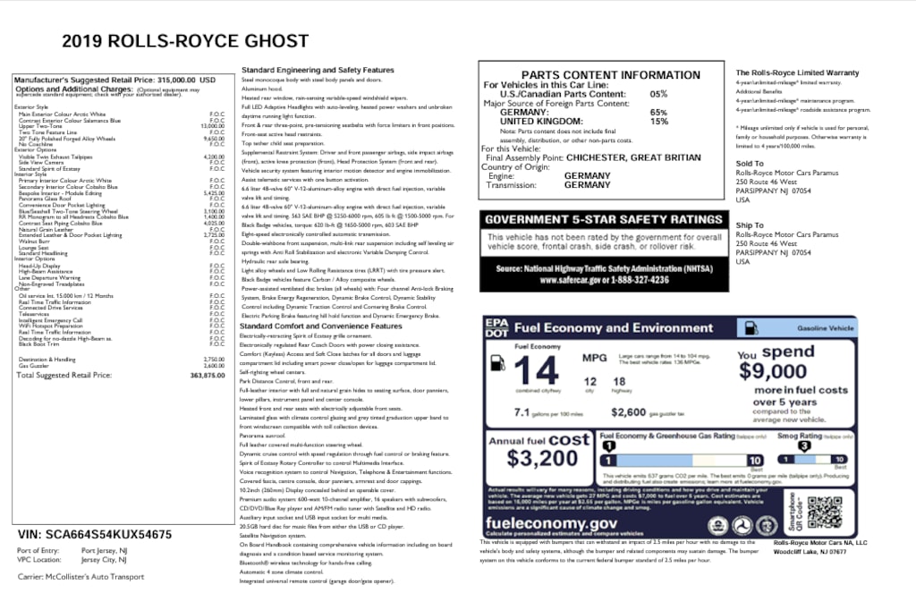 The Ghost features rear-wheel drive and is equipped with an 8-speed automatic transmission, ensuring a smooth and responsive driving experience. Its suspension system is designed to provide exceptional ride comfort, contributing to a serene journey for all occupants. The vehicle's estimated fuel economy is 12 mpg in the city and 18 mpg on the highway.
