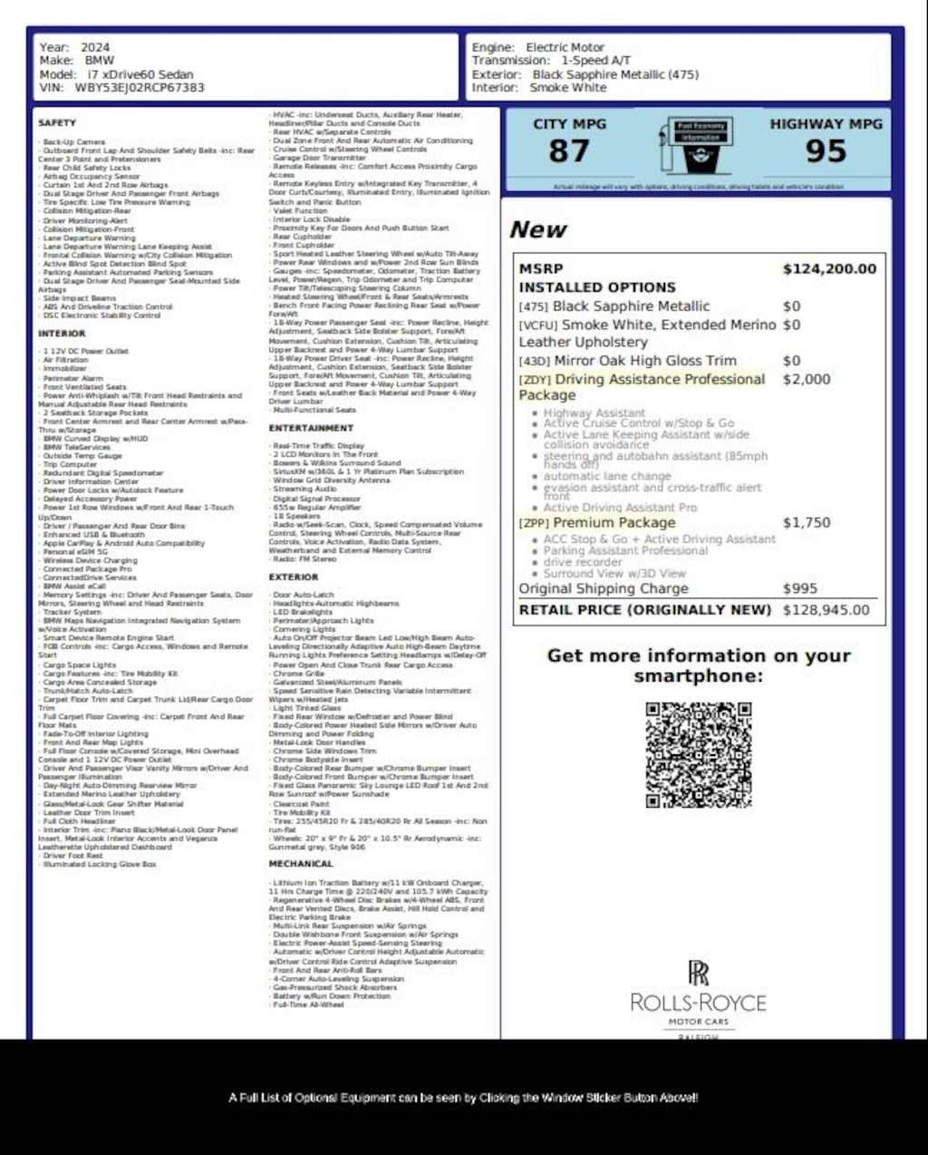 Come See this BMW and Many More at Rolls-Royce Motor Cars Raleigh!!, A Full List of Optional Equipment can be seen by Clicking the Window Sticker Button Above!!, i7 xDrive60, Electric Motor, AWD, Black Sapphire Metallic, Smoke White Smoke White Extended Merino L, ACC Stop & Go + Active Driving Assistant, Active Driving Assistant Pro, Automatic temperature control, Bowers & Wilkins Surround Sound, Connected Package Pro, Driving Assistance Professional Package, Exterior Parking Camera Rear, Heads-Up Display, Highway Assistant, Navigation system: BMW Maps Navigation, Parking Assistant Professional, Premium Package, Surround View w/3D View, 18 Speakers, 4-Wheel Disc Brakes, ABS brakes, Adaptive suspension, Air Conditioning, Alloy wheels, Anti-whiplash front head restraints, Apple CarPlay & Android Auto Compatibility, Auto High-beam Headlights, Auto tilt-away steering wheel, Auto-dimming door mirrors, Auto-dimming Rear-View mirror, Auto-leveling suspension, BMW Assist eCall, BMW Curved Display w/HUD, BMW TeleServices, Brake assist, Bumpers: body-color, ConnectedDrive Services, Delay-off headlights, Door auto-latch, Driver door bin, Driver vanity mirror, Dual front impact airbags, Dual front side impact airbags, Electronic Stability Control, Emergency communication system: BMW Assist eCall, Enhanced USB & Bluetooth, Extended Merino Leather Upholstery, Four wheel independent suspension, Front anti-roll bar, Front Bucket Seats, Front Center Armrest, Front dual zone A/C, Front reading lights, Front Ventilated Seats, Fully automatic headlights, Garage door transmitter, Genuine wood dashboard insert, Head restraints memory, Heated door mirrors, Heated front seats, Heated rear seats, Heated steering wheel, Heated Steering Wheel/Front & Rear Seats/Armrests, Illuminated entry, Illuminated Kidney Grille, Leather steering wheel, Low tire pressure warning, Memory seat, Multi-Functional Seats, Occupant sensing airbag, Outside temperature display, Overhead airbag, Overhead console, Panic alarm, Passenger door bin, Passenger vanity mirror, Personal eSIM 5G, Power adjustable front head restraints, Power door mirrors, Power driver seat, Power passenger seat, Power steering, Power windows, Radio data system, Radio: FM Stereo, Rain sensing wipers, Rear air conditioning, Rear anti-roll bar, Rear audio controls, Rear dual zone A/C, Rear reading lights, Rear seat center armrest, Rear Window Blind, Rear window defroster, Remote keyless entry, Security system, SiriusXM w/360L & 1 Yr Platinum Plan Subscription, Speed control, Speed-sensing steering, Speed-Sensitive Wipers, Sport steering wheel, Steering wheel memory, Steering wheel mounted audio controls, Telescoping steering wheel, Tilt steering wheel, Traction control, Trip computer, Variably intermittent wipers, Ventilated front seats, Weather band radio, Wheels: 20" x 9" Fr & 20" x 10.5" Rr Aerodynamic, Wireless Device Charging, i7 xDrive60, Electric Motor, AWD, Black Sapphire Metallic, Smoke White Smoke White Extended Merino L, ACC Stop & Go + Active Driving Assistant, Active Driving Assistant Pro, Automatic temperature control, Bowers & Wilkins Surround Sound, Connected Package Pro, Driving Assistance Professional Package, Exterior Parking Camera Rear, Heads-Up Display, Highway Assistant, Navigation system: BMW Maps Navigation, Parking Assistant Professional, Premium Package, Surround View w/3D View. Black Sapphire Metallic