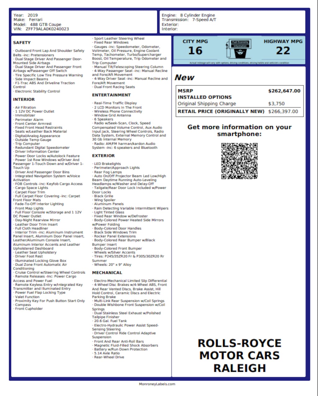 Come See this Ferrari and Many More at Rolls-Royce Motor Cars Raleigh!!, A Full List of Optional Equipment can be seen by Clicking the Window Sticker Button Above!!. 16/22 City/Highway MPG Nero Daytona Metallic