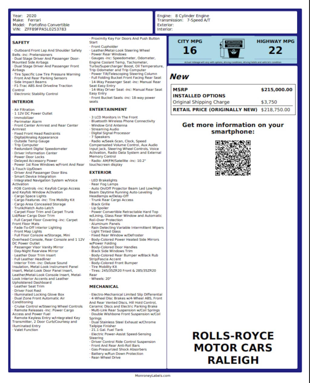 Come See this Ferrari and Many More at Rolls-Royce Motor Cars Raleigh!!, A Full List of Optional Equipment can be seen by Clicking the Window Sticker Button Above!!, Convertible HardTop, 20" Wheels, 4-Wheel Disc Brakes, 7 Speakers, ABS brakes, Air Conditioning, Alloy wheels, AM/FM radio: SiriusXM, Apple CarPlay, Automatic temperature control, Bumpers: body-color, Ceramic disc brakes: front and rear, Convertible roof lining, Delay-off headlights, Driver door bin, Dual front impact airbags, Dual front side impact airbags, Electronic Stability Control, Four wheel independent suspension, Front anti-roll bar, Front Bucket Seats, Front Center Armrest, Front dual zone A/C, Front reading lights, Fully automatic headlights, Glass rear window, Heated door mirrors, Illuminated entry, Integrated roll-over protection, Leather Seat Trim, Low tire pressure warning, Navigation System, Outside temperature display, Overhead console, Passenger door bin, Passenger vanity mirror, Power convertible roof, Power door mirrors, Power driver seat, Power passenger seat, Power steering, Power windows, Radio data system, Radio: AM/FM/Satellite, Rain sensing wipers, Rear anti-roll bar, Rear fog lights, Rear seat center armrest, Rear window defroster, Remote keyless entry, Security system, Speed control, Speed-sensing steering, Spoiler, Steering wheel mounted audio controls, Tachometer, Telescoping steering wheel, Tilt steering wheel, Traction control, Trip computer, Variably intermittent wipers, Convertible HardTop. 16/22 City/Highway MPG Nero