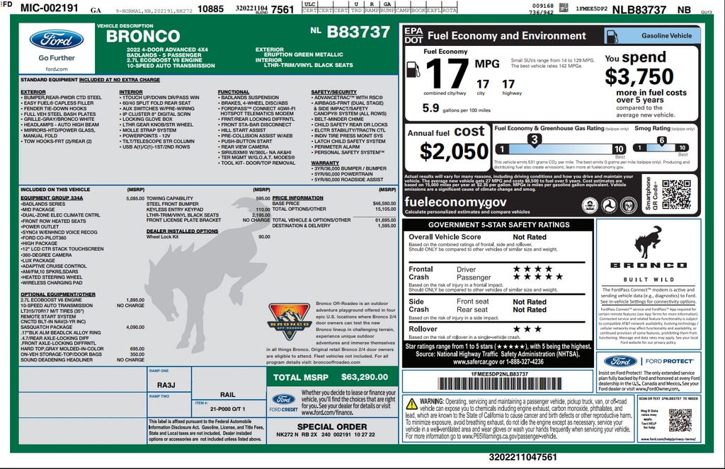 2022 Ford Bronco Badlands 2.7L EcoBoost V6 4WD 10-Speed Automatic