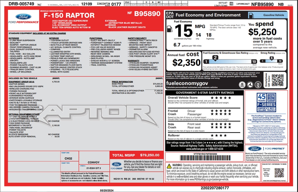 Come See this Ford and Many More at Rolls-Royce Motor Cars Raleigh!!, A Full List of Optional Equipment can be seen by Clicking the Window Sticker Button Above!!, 4WD, 360 Degree Camera, Connected Built-In Navigation, Convenience Package, Electronic Locking w/4.10 Axle Ratio, Equipment Group 801A High, Forward Sensing System, Front-Axle w/Torsen Differential, GVWR: 7,050 lbs Payload Package, Heated Steering Wheel, Integrated Trailer Brake Controller, Interior Work Surface, Leather Trim Seats w/Heated 2nd Row, LED Projector w/Dynamic Bending Headlamps, Moonroof & Tailgate, Partitioned Lockable Fold-Flat Storage, Power Tailgate, Power Tilt/Telescoping Steering Column w/Memory, Pro Trailer Backup Assist, Radio: B&O Unleashed Sound System by Bang & Olufsen, Rain-Sensing Wipers, Rigid LED Fog Lamp, SYNC 4 w/Enhanced Voice Recognition, Tailgate Applique FORD, Torsen Package, Tow Technology Package, Twin Panel Moonroof, Universal Garage Door Opener, Wireless Charging Pad, 17" Cast Aluminum Wheels, 4-Wheel Disc Brakes, 7 Speakers, ABS brakes, Adaptive suspension, Adjustable pedals, Air Conditioning, Alloy wheels, AM/FM radio: SiriusXM with 360L, Auto High-beam Headlights, Auto Start-Stop Removal, Auto-dimming door mirrors, Auto-dimming Rear-View mirror, Automatic temperature control, Brake assist, Bumpers: body-color, Compass, Delay-off headlights, Driver door bin, Driver vanity mirror, Dual front impact airbags, Dual front side impact airbags, Electronic Stability Control, Emergency communication system, Exterior Parking Camera Rear, Front anti-roll bar, Front Bucket Seats, Front Center Armrest, Front dual zone A/C, Front reading lights, Front wheel independent suspension, Fully automatic headlights, Heated door mirrors, Heated front seats, Illuminated entry, Lane Departure Warning System, Leather Trim Seats, Low tire pressure warning, Memory seat, Navigation system: Connected Navigation, Occupant sensing airbag, Outside temperature display, Overhead airbag, Overhead console, Panic alarm, Passenger door bin, Passenger vanity mirror, Pedal memory, Power door mirrors, Power driver seat, Power passenger seat, Power steering, Power windows, Radio data system, Radio: AM/FM SiriusXM w/360L, Rear reading lights, Rear step bumper, Rear window defroster, Remote keyless entry, Security system, Speed control, Speed-sensing steering, Split folding rear seat, Steering wheel mounted audio controls, Tachometer, Telescoping steering wheel, Tilt steering wheel, Traction control, Trip computer, Turn signal indicator mirrors, Variably intermittent wipers, Ventilated front seats, 4WD, 360 Degree Camera, Connected Built-In Navigation, Convenience Package, Electronic Locking w/4.10 Axle Ratio, Equipment Group 801A High, Forward Sensing System, Front-Axle w/Torsen Differential, GVWR: 7,050 lbs Payload Package, Heated Steering Wheel, Integrated Trailer Brake Controller, Interior Work Surface, Leather Trim Seats w/Heated 2nd Row, LED Projector w/Dynamic Bending Headlamps, Moonroof & Tailgate, Partitioned Lockable Fold-Flat Storage, Power Tailgate, Power Tilt/Telescoping Steering Column w/Memory, Pro Trailer Backup Assist, Radio: B&O Unleashed Sound System by Bang & Olufsen, Rain-Sensing Wipers, Rigid LED Fog Lamp, SYNC 4 w/Enhanced Voice Recognition, Tailgate Applique FORD, Torsen Package, Tow Technology Package, Twin Panel Moonroof, Universal Garage Door Opener, Wireless Charging Pad. 15/18 City/Highway MPG Antimatter Blue Metallic