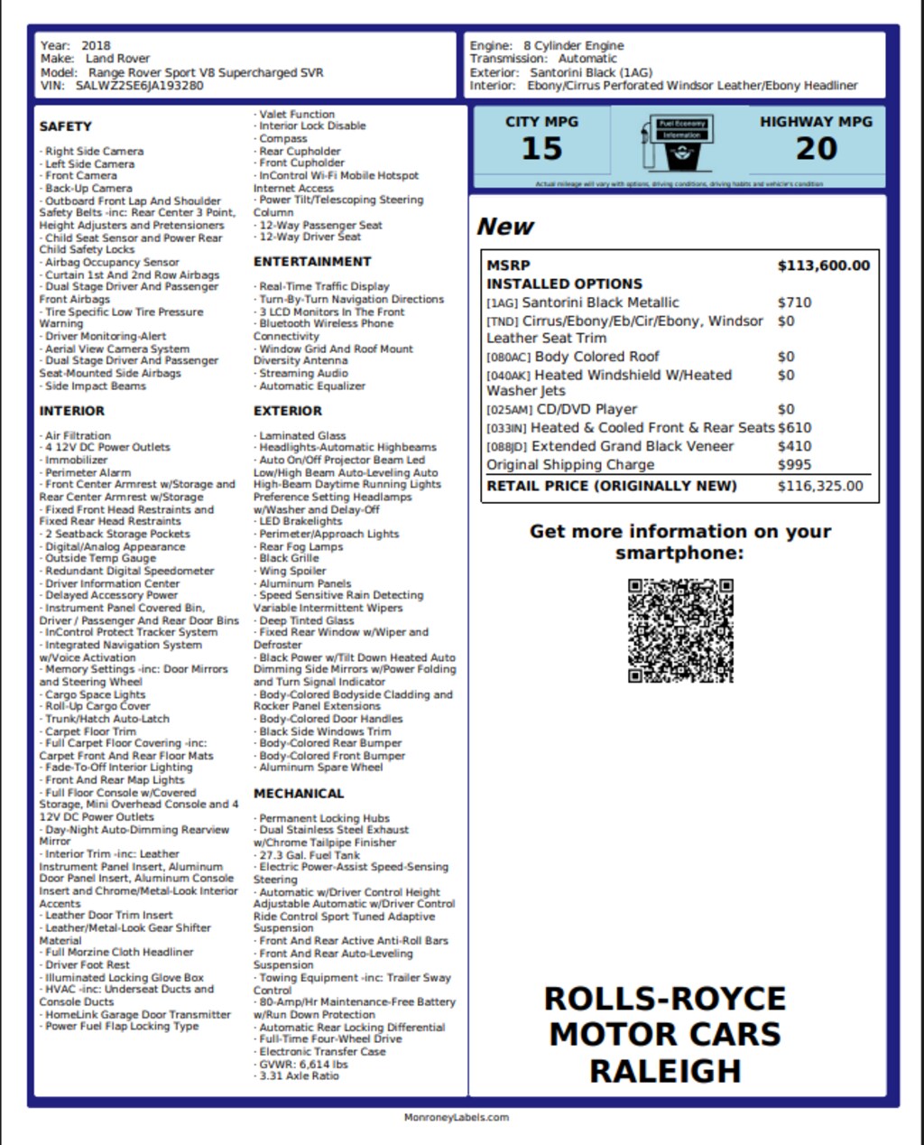 Come See this Land Rover and Many More at Rolls-Royce Motor Cars Raleigh!!, A Full List of Optional Equipment can be seen by Clicking the Window Sticker Button Above!!, 16-Way Heated SVR Performance Front Seats w/Memory, 19 Speakers, 3.31 Axle Ratio, 4-Wheel Disc Brakes, ABS brakes, Adaptive suspension, Air Conditioning, Alloy wheels, AM/FM radio: SiriusXM, Auto High-beam Headlights, Auto tilt-away steering wheel, Auto-dimming door mirrors, Auto-dimming Rear-View mirror, Auto-leveling suspension, Automatic temperature control, Brake assist, Bumpers: body-color, Child-Seat-Sensing Airbag, Compass, Delay-off headlights, Driver door bin, Driver vanity mirror, Dual front impact airbags, Dual front side impact airbags, Electronic Stability Control, Emergency communication system: InControl Protect, Exterior Parking Camera Rear, Four wheel independent suspension, Front anti-roll bar, Front Bucket Seats, Front Center Armrest w/Storage, Front dual zone A/C, Front reading lights, Fully automatic headlights, Garage door transmitter: HomeLink, Headlight cleaning, Heated door mirrors, Heated front seats, Heated rear seats, Illuminated entry, Leather Shift Knob, Low tire pressure warning, Memory seat, Navigation system: InControl Navigation Pro, Occupant sensing airbag, Outside temperature display, Overhead airbag, Overhead console, Panic alarm, Passenger door bin, Passenger vanity mirror, Power door mirrors, Power driver seat, Power Liftgate, Power passenger seat, Power steering, Power windows, Radio data system, Radio: Meridian Surround Sound System (825W), Rain sensing wipers, Rear air conditioning, Rear anti-roll bar, Rear fog lights, Rear Parking Sensors, Rear reading lights, Rear seat center armrest, Rear window defroster, Rear window wiper, Remote keyless entry, Security system, Sliding Panoramic Roof, Speed control, Speed-sensing steering, Speed-Sensitive Wipers, Split folding rear seat, Spoiler, Steering wheel memory, Steering wheel mounted audio controls, Sunroof, Tachometer, Telescoping steering wheel, Tilt steering wheel, Traction control, Trip computer, Turn signal indicator mirrors, Variably intermittent wipers, Wheels: 21" 5 Split-Spoke 'Style 5091', Windsor Leather Seat Trim. 15/20 City/Highway MPG Matte Black