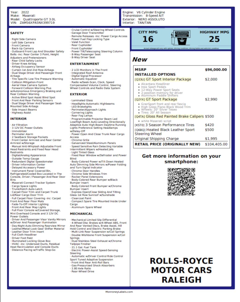 Come See this Maserati and Many More at Rolls-Royce Motor Cars Raleigh!!, A Full List of Optional Equipment can be seen by Clicking the Window Sticker Button Above!!, 3.0L V6, 10 Speakers, 4-Wheel Disc Brakes, ABS brakes, Adaptive suspension, Air Conditioning, Alloy wheels, AM/FM radio: SiriusXM, Anti-whiplash front head restraints, Apple CarPlay/Android Auto, Auto High-beam Headlights, Auto tilt-away steering wheel, Auto-dimming door mirrors, Auto-dimming Rear-View mirror, Automatic temperature control, Brake assist, Bumpers: body-color, Delay-off headlights, Driver door bin, Driver vanity mirror, Dual front impact airbags, Dual front side impact airbags, Electronic Stability Control, Emergency communication system: Maserati Connect, Extended Leather Seat Upholstery, Exterior Parking Camera Rear, Four wheel independent suspension, Front anti-roll bar, Front Bucket Seats, Front Center Armrest, Front dual zone A/C, Front reading lights, Garage door transmitter, Genuine wood console insert, Genuine wood dashboard insert, harman/kardon® Speakers, Heated door mirrors, Heated Front Bucket Seats, Heated front seats, Heated steering wheel, Illuminated entry, Knee airbag, Leather Shift Knob, Leather steering wheel, Low tire pressure warning, Memory seat, Navigation System, Occupant sensing airbag, Outside temperature display, Overhead airbag, Overhead console, Passenger door bin, Passenger vanity mirror, Power door mirrors, Power driver seat, Power passenger seat, Power steering, Power windows, Radio data system, Radio: AM/FM w/Maserati Intelligent Assistant, Rain sensing wipers, Rear anti-roll bar, Rear fog lights, Rear reading lights, Rear seat center armrest, Rear Window Blind, Rear window defroster, Remote keyless entry, Security system, Speed control, Speed-sensing steering, Speed-Sensitive Wipers, Split folding rear seat, Steering wheel memory, Steering wheel mounted audio controls, Sunroof, Tachometer, Telescoping steering wheel, Tilt steering wheel, Traction control, Trip computer, Turn signal indicator mirrors, Variably intermittent wipers, Voltmeter, Wheels: 19" Silver Poseidone, 3.0L V6. 16/25 City/Highway MPG -Select-