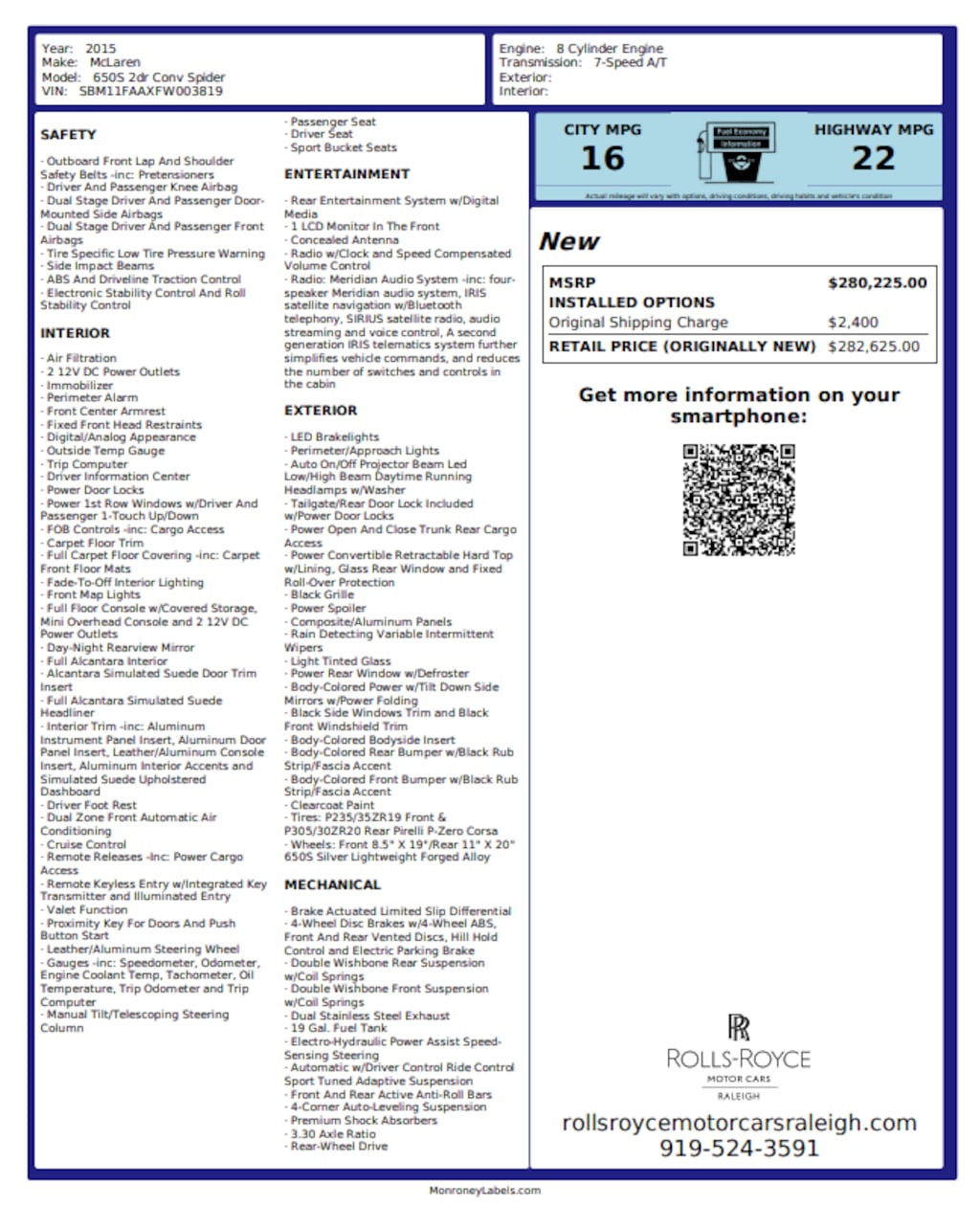 The 2015 McLaren 650S Base is a high-performance supercar that combines advanced engineering with striking design. Powered by a 3.8-liter twin-turbocharged V8 engine producing 641 horsepower and 500 lb-ft of torque, it accelerates from 0 to 60 mph in approximately 2.9 seconds and reaches a top speed of 207 mph. Its carbon-fiber monocoque chassis, adaptive suspension, and aerodynamic enhancements ensure exceptional handling and driving dynamics, making it a standout in the supercar segment. 4 Speakers, 4-Wheel Disc Brakes, ABS brakes, Adaptive suspension, Air Conditioning, Alloy wheels, AM/FM radio: SIRIUS, Auto-leveling suspension, Automatic temperature control, Bumpers: body-color, Convertible HardTop, Convertible roof lining, Dual front impact airbags, Dual front side impact airbags, Electronic Stability Control, Four wheel independent suspension, Front Bucket Seats, Front Center Armrest, Front dual zone A/C, Front reading lights, Full Alcantara Interior, Fully automatic headlights, Glass rear window, Headlight cleaning, Illuminated entry, Integrated roll-over protection, Knee airbag, Low tire pressure warning, Navigation System, Outside temperature display, Overhead console, Power convertible roof, Power door mirrors, Power steering, Power windows, Radio: Meridian Audio System, Rain sensing wipers, Rear window defroster, Remote keyless entry, Security system, Speed control, Speed-sensing steering, Spoiler, Sport Bucket Seats, Tachometer, Telescoping steering wheel, Tilt steering wheel, Traction control, Trip computer, Variably intermittent wipers, Wheels: Front 8.5" X 19"/Rear 11" X 20" 650S Silver Lightweight Forged Alloy.