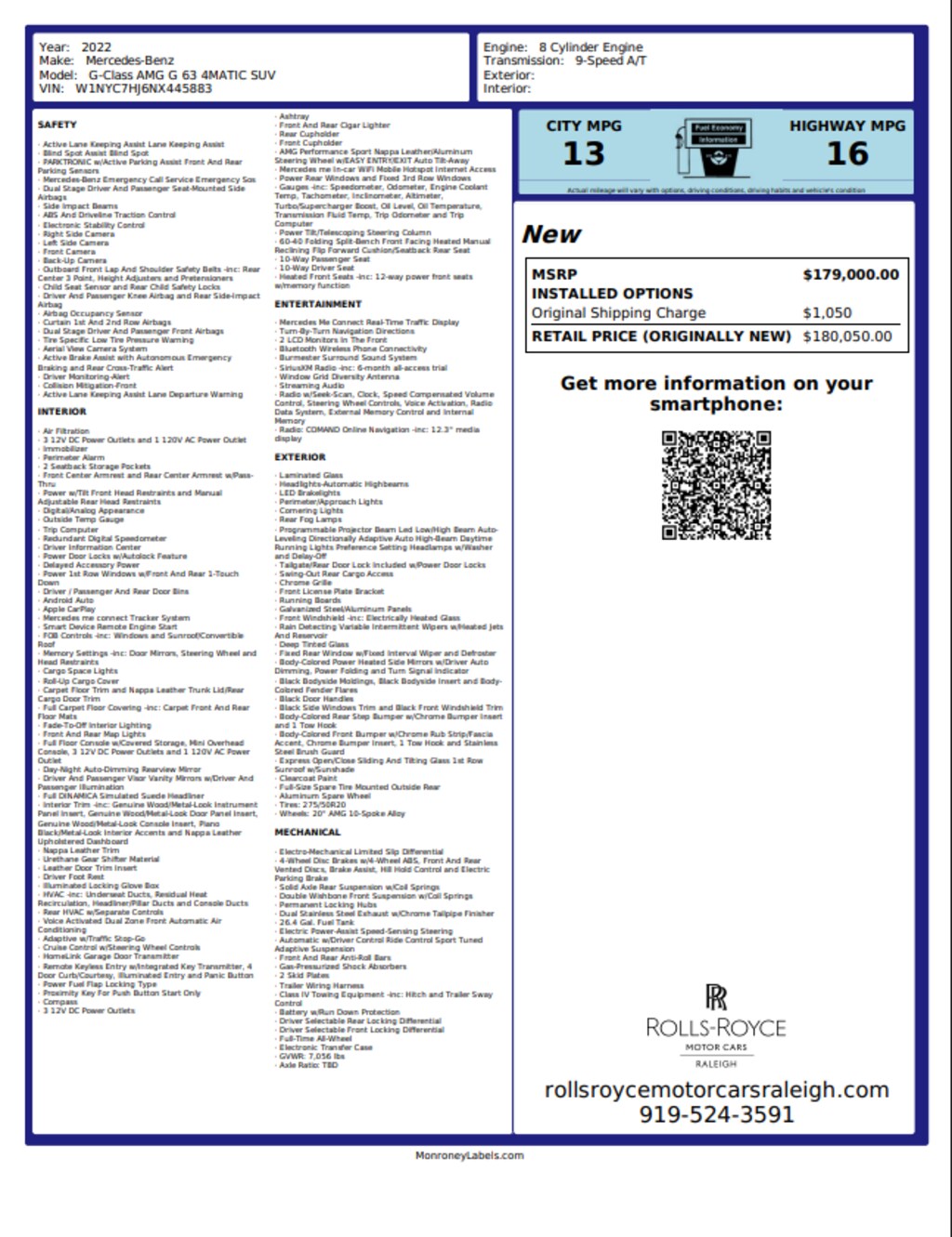 The 2022 Mercedes-AMG G 63 4MATIC is a bold fusion of luxury and off-road prowess, powered by a handcrafted 4.0-liter twin-turbo V8 engine producing 577 horsepower and 627 lb-ft of torque. This powerhouse accelerates from 0 to 60 mph in approximately 4.4 seconds, thanks to its 9-speed automatic transmission and full-time all-wheel drive system . Inside, the G 63 offers a lavish cabin with advanced technology, while its iconic boxy design ensures it stands out on any terrain. 15 Speakers, 4-Wheel Disc Brakes, ABS brakes, Adaptive suspension, Air Conditioning, Alloy wheels, AM/FM radio: SiriusXM, Android Auto®, Apple CarPlay®, Apple CarPlay®/Android Auto®, Auto High-beam Headlights, Auto tilt-away steering wheel, Auto-dimming door mirrors, Auto-dimming Rear-View mirror, Automatic temperature control, Axle Ratio: TBD, Bodyside moldings, Brake assist, Bumpers: body-color, Burmester® Surround Sound System, Child-Seat-Sensing Airbag, Compass, Delay-off headlights, Driver door bin, Driver vanity mirror, Dual front impact airbags, Dual front side impact airbags, Electronic Stability Control, Emergency communication system: Mercedes-Benz Emergency Call Service, Exterior Parking Camera Rear, Front anti-roll bar, Front Bucket Seats, Front Center Armrest, Front dual zone A/C, Front reading lights, Front wheel independent suspension, Garage door transmitter: HomeLink, Genuine wood console insert, Genuine wood dashboard insert, Genuine wood door panel insert, Head restraints memory, Headlight cleaning, Heated door mirrors, Heated front seats, Heated rear seats, Illuminated entry, Knee airbag, Low tire pressure warning, Memory seat, Nappa Leather Trim, Navigation System, Occupant sensing airbag, Outside temperature display, Overhead airbag, Overhead console, Panic alarm, Passenger door bin, Passenger vanity mirror, Power adjustable front head restraints, Power door mirrors, Power driver seat, Power passenger seat, Power steering, Power windows, Radio data system, Radio: COMAND® Online Navigation, Rain sensing wipers, Rear air conditioning, Rear anti-roll bar, Rear fog lights, Rear Front Seats, Rear reading lights, Rear seat center armrest, Rear side impact airbag, Rear window defroster, Rear window wiper, Remote keyless entry, Security system, SiriusXM Radio, Speed control, Speed-sensing steering, Split folding rear seat, Sport steering wheel, Steering wheel memory, Steering wheel mounted audio controls, Sunroof, Tachometer, Telescoping steering wheel, Tilt steering wheel, Traction control, Trip computer, Turn signal indicator mirrors, Variably intermittent wipers, Wheels: 20" AMG® 10-Spoke Alloy.