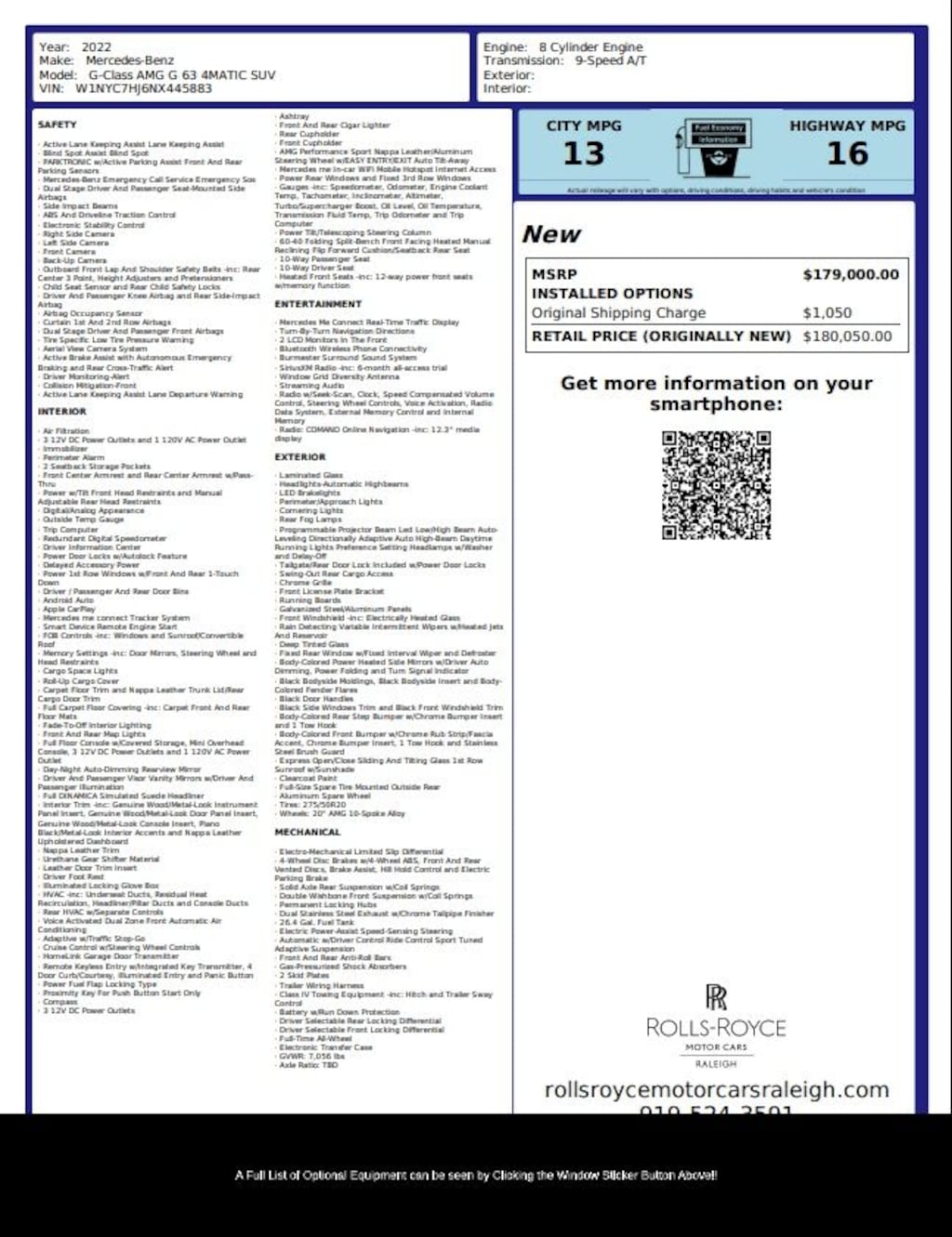 Come See this Mercedes-Benz and Many More at Rolls-Royce Motor Cars Raleigh!!, A Full List of Optional Equipment can be seen by Clicking the Window Sticker Button Above!!, G 63 AMG® 4MATIC®, V8, 4MATIC®, Obsidian Black Metallic, Black Leather, AMG® Night Package (P56), AMG® Night Package Plus, Apple CarPlay®/Android Auto®, Black Under Guard Protection, Brush Guard in Black, Burmester® Surround Sound System, Drive-Dynamic Multicontour Front Seats w/Massage, ENERGIZING Comfort Control, Exterior Lettering in Black, Exterior Mirrors in Obsidian Black, Front Ventilated Seats, Gunmetal Grey Front Grille, Mercedes-Benz Star in Black, Rapid Heating Front Seats, Roof in Obsidian Black, Seat Comfort Package, Spare Wheel Cover in Obsidian Black, Wheel Arches & Bumpers in Black, 15 Speakers, 4-Wheel Disc Brakes, ABS brakes, Adaptive suspension, Air Conditioning, Alloy wheels, AM/FM radio: SiriusXM, Android Auto®, Apple CarPlay®, Auto High-beam Headlights, Auto tilt-away steering wheel, Auto-dimming door mirrors, Auto-dimming Rear-View mirror, Automatic temperature control, Axle Ratio: TBD, Bodyside moldings, Brake assist, Bumpers: body-color, Child-Seat-Sensing Airbag, Compass, Delay-off headlights, Driver door bin, Driver vanity mirror, Dual front impact airbags, Dual front side impact airbags, Electronic Stability Control, Emergency communication system: Mercedes-Benz Emergency Call Service, Exterior Parking Camera Rear, Front anti-roll bar, Front Bucket Seats, Front Center Armrest, Front dual zone A/C, Front reading lights, Front wheel independent suspension, Garage door transmitter: HomeLink, Genuine wood console insert, Genuine wood dashboard insert, Genuine wood door panel insert, Head restraints memory, Headlight cleaning, Heated door mirrors, Heated front seats, Heated rear seats, Illuminated entry, Knee airbag, Low tire pressure warning, Memory seat, Nappa Leather Trim, Navigation System, Occupant sensing airbag, Outside temperature display, Overhead airbag, Overhead console, Panic alarm, Passenger door bin, Passenger vanity mirror, Power adjustable front head restraints, Power door mirrors, Power driver seat, Power passenger seat, Power steering, Power windows, Radio data system, Radio: COMAND® Online Navigation, Rain sensing wipers, Rear air conditioning, Rear anti-roll bar, Rear fog lights, Rear Front Seats, Rear reading lights, Rear seat center armrest, Rear side impact airbag, Rear window defroster, Rear window wiper, Remote keyless entry, Security system, SiriusXM Radio, Speed control, Speed-sensing steering, Split folding rear seat, Sport steering wheel, Steering wheel memory, Steering wheel mounted audio controls, Sunroof, Tachometer, Telescoping steering wheel, Tilt steering wheel, Traction control, Trip computer, Turn signal indicator mirrors, Variably intermittent wipers, Wheels: 20" AMG® 10-Spoke Alloy, G 63 AMG® 4MATIC®, V8, 4MATIC®, Obsidian Black Metallic, Black Leather, AMG® Night Package (P56), AMG® Night Package Plus, Apple CarPlay®/Android Auto®, Black Under Guard Protection, Brush Guard in Black, Burmester® Surround Sound System, Drive-Dynamic Multicontour Front Seats w/Massage, ENERGIZING Comfort Control, Exterior Lettering in Black, Exterior Mirrors in Obsidian Black, Front Ventilated Seats, Gunmetal Grey Front Grille, Mercedes-Benz Star in Black, Rapid Heating Front Seats, Roof in Obsidian Black, Seat Comfort Package, Spare Wheel Cover in Obsidian Black, Wheel Arches & Bumpers in Black. 13/16 City/Highway MPG Obsidian Black Metallic
