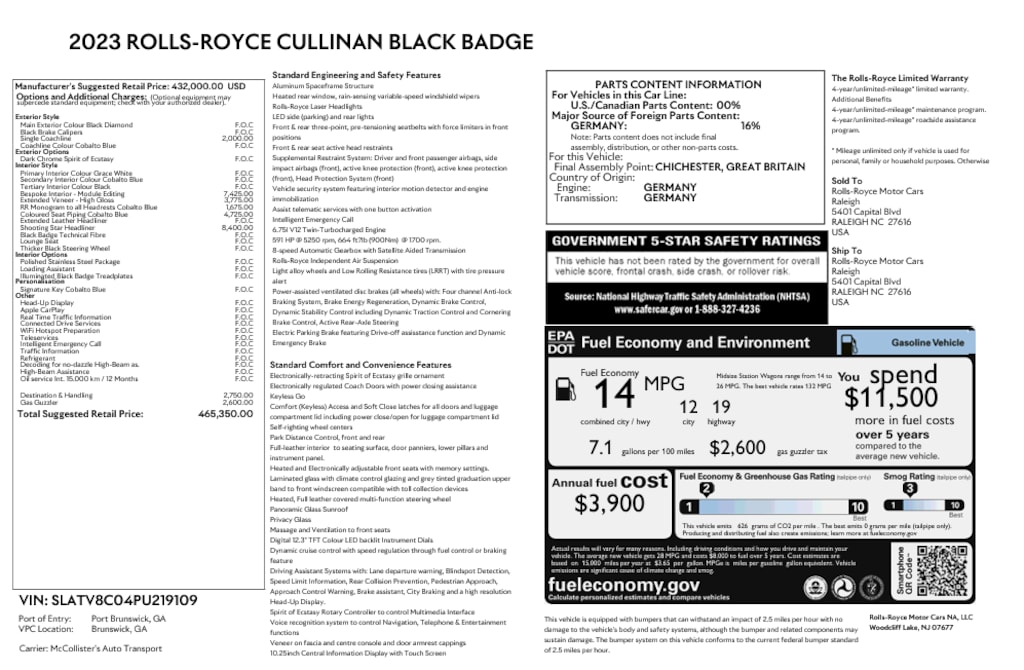 Come See this Rolls-Royce and Many More at Rolls-Royce Motor Cars Raleigh!!, A Full List of Optional Equipment can be seen by Clicking the Window Sticker Button Above!!, 16 Speakers, 2.81 Axle Ratio, 4-Wheel Disc Brakes, ABS brakes, Adaptive suspension, Air Conditioning, Alloy wheels, AM/FM radio: SiriusXM, Anti-whiplash front head restraints, Auto High-beam Headlights, Auto tilt-away steering wheel, Auto-dimming door mirrors, Auto-dimming Rear-View mirror, Auto-leveling suspension, Automatic temperature control, Bodyside moldings, Brake assist, Bumpers: body-color, CD player, Compass, Delay-off headlights, Driver door bin, Driver vanity mirror, Dual front impact airbags, Dual front side impact airbags, DVD-Audio, Electronic Stability Control, Emergency communication system: Rolls-Royce Assist, Exterior Parking Camera Rear, Four wheel independent suspension, Front anti-roll bar, Front Bucket Seats, Front Center Armrest w/Storage, Front dual zone A/C, Front Massage Seats, Front reading lights, Garage door transmitter, Heads-Up Display, Heated & Ventilated Front Bucket Seats, Heated door mirrors, Heated front seats, Heated rear seats, Heated steering wheel, Illuminated entry, Knee airbag, Leather steering wheel, Low tire pressure warning, Memory seat, Navigation System, Occupant sensing airbag, Outside temperature display, Overhead airbag, Overhead console, Panic alarm, Passenger door bin, Passenger vanity mirror, Power adjustable rear head restraints, Power door mirrors, Power driver seat, Power passenger seat, Power steering, Power windows, Premium Leather Seat Trim, Radio data system, Radio: AM/FM/CD Audio System w/18 Speakers, Rain sensing wipers, Rear air conditioning, Rear anti-roll bar, Rear dual zone A/C, Rear reading lights, Rear seat center armrest, Rear window defroster, Remote keyless entry, Security system, Speed control, Speed-sensing steering, Split folding rear seat, Spoiler, Steering wheel memory, Steering wheel mounted audio controls, Sunroof, Telescoping steering wheel, Tilt steering wheel, Traction control, Trip computer, Variably intermittent wipers, Ventilated front seats, Weather band radio, Wheels: 22" Part Polished Black Badge. 12/19 City/Highway MPG Black Diamond
